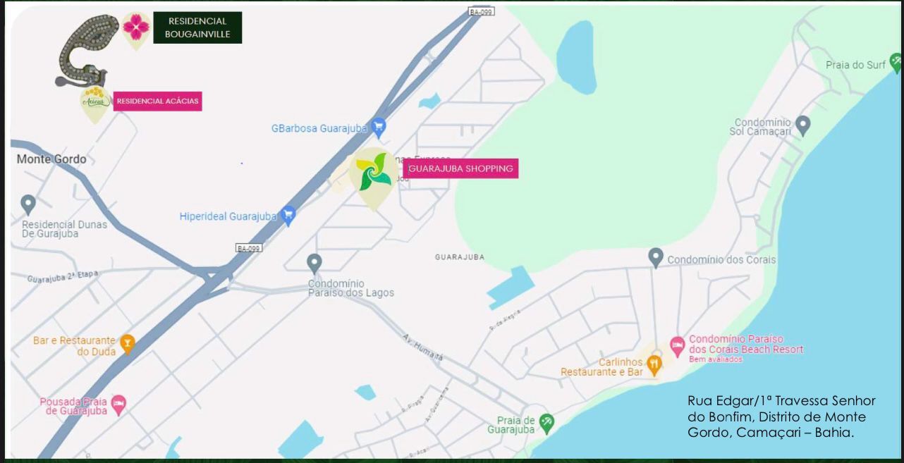 Rua Senhor do Bonfim, S/NMonte Gordo - Camaçari-BA - Localizada em frente a entrada principal de Guarajuba - Lado oposto praia 1,5 km da Praia de Guarajuba.