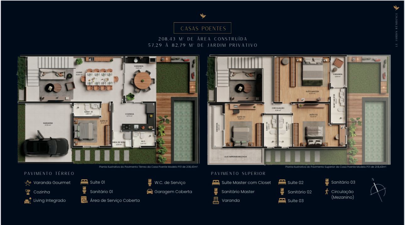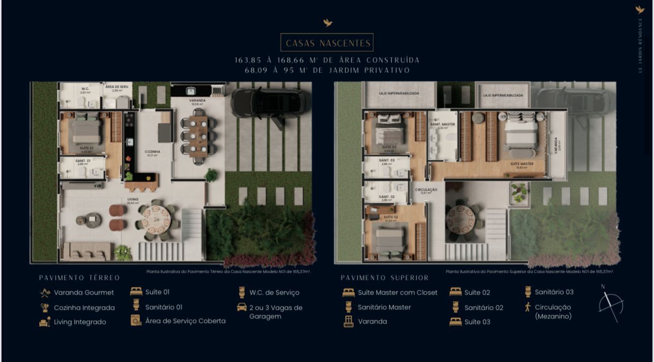Casas duplex de 163,85 à 208,43 m² de área construída com 04 suítes e pé direto duplo com mezanino, opções com jardim de 57,00 à 95,00 m², projetadas cuidadosamente para que você e a sua família aproveitem os melhores momentos da vida, com todo o conforto e sofisticação!