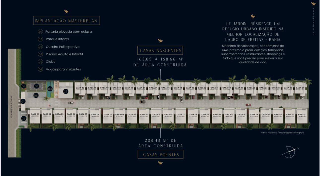 O Le Jardin Résidence possui 42 casas, tem um projeto inovador que redefine o conceito de qualidade de vida e exclusividade, oferece uma arquitetura moderna, com 06 modelos diferentes de fachadas e plantas personalizáveis.